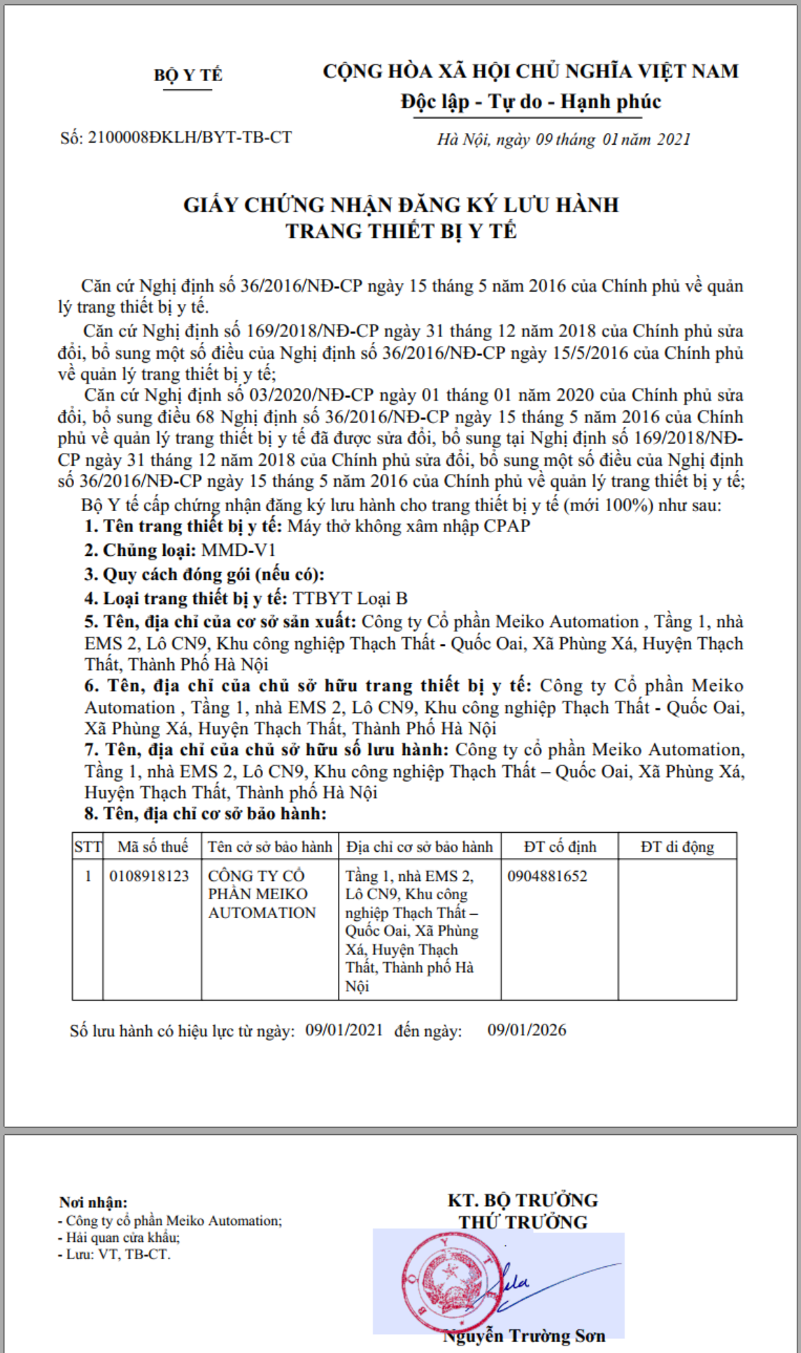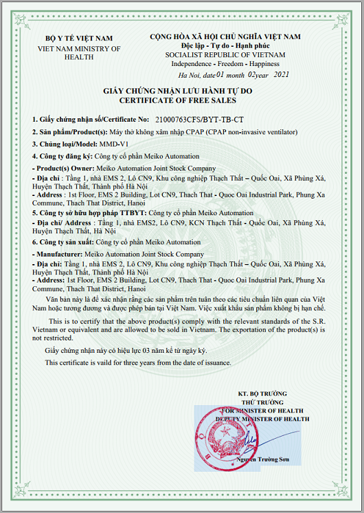 Sau một thời gian thử nghiệm và đánh giá trên người tại bệnh viện Bạch Mai, máy thở không xâm nhập CPAP MMD-V1 của chúng tôi đã chính thức được Bộ y tế cấp Giấy chứng nhận đăng ký lưu hành trang thiết bị y tế số 2100008ĐKLH/BYT-TB-CT và Giấy chứng nhận lưu hành tự do số 21000763CFS/BYT-TB-CT.